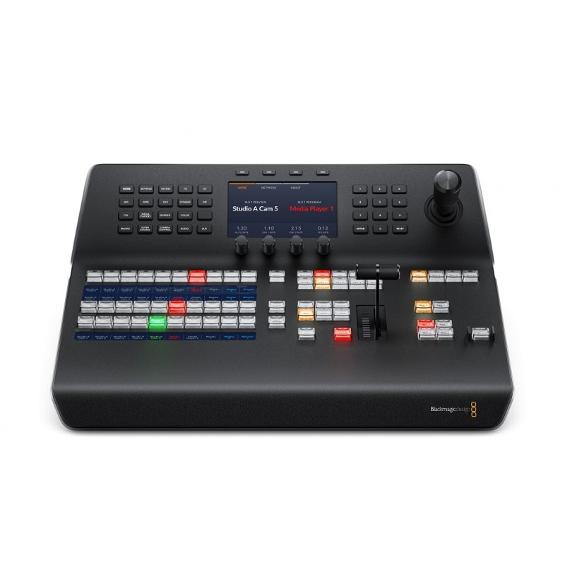 The new ATEM 1 M/E Advanced Panel is an elegantly designed professional hardware control panel for all ATEM switchers. It combines modern design with the latest broadcast technology for faster workflows. The new design features a built in LCD and high quality curved buttons that help reduce incorrect key presses. The buttons also have color backlighting to help you quickly recognize important keys. You also get a professional joystick for DVE and camera adjustments, smooth weighted t-bar fader and much more. The buttons feature dynamic displays that allow full customization of the labels as well as custom colors. The shift buttons allow you to double up the number of inputs by selecting a second set of shifted source buttons so you can control up to 20 inputs. The compact size and durable design of the ATEM 1 M/E Advanced Panel fits in a standard equipment rack, making it perfect for shelf mounting in broadcast trucks, mobile racks and fly away kits.