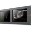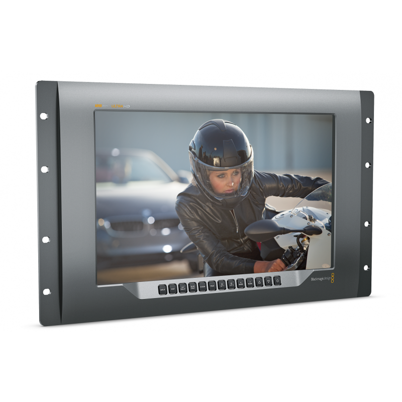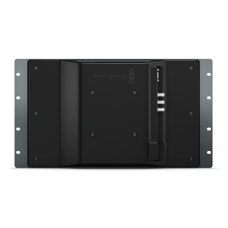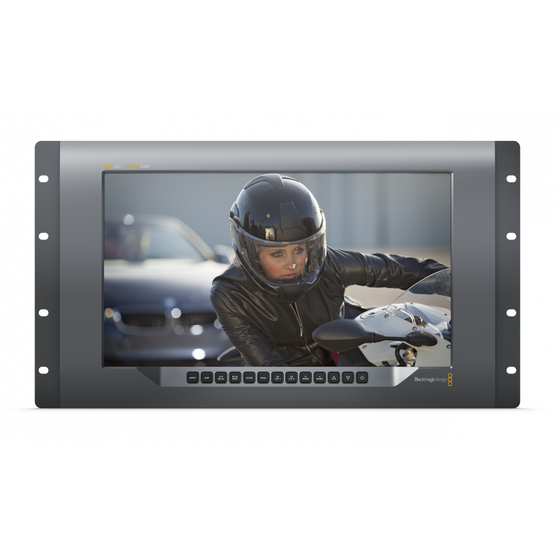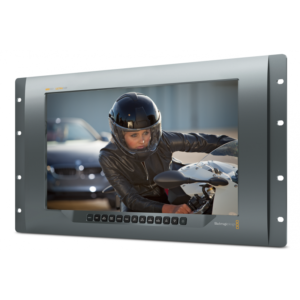 The Blackmagic Design SmartView 4K is a professional 15.6″ TFT LCD monitor with a native resolution of 3840×2160 and two multi-rate 12G-SDI inputs. The inputs automatically switch between SD, HD, and 4K formats, including Ultra HD (3840×2160) at 60 fps and DCI 4K (4096×2160) at 24 fps. The machined metal frame provides built-in control buttons for access to advanced broadcast features, including 3D LUTs, H/V delay, blue channel only, and customizable frame markers. The chassis is rack-mountable (6 RU) and also has VESA mounting holes for installation on articulating arms.