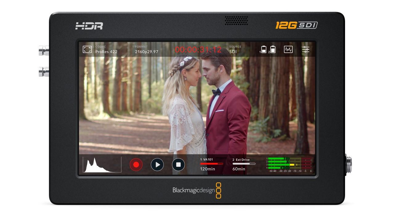Blackmagic Video Assist 5” 12G HDR adds professional monitoring and recording to any SDI or HDMI camera in all HD, Ultra HD, 2K and 4K DCI formats! The super bright 2500nit 5 inch HDR monitor supports 3D LUTs and features professional scopes along with powerful focus assist and exposure tools that help you accurately set focus, exposure and frame shots. The built in SD card recorder save files in broadcast quality 10‑bit 4:2:2 ProRes or DNx formats. The files are all standard, so you can start editing immediately without having to convert them!