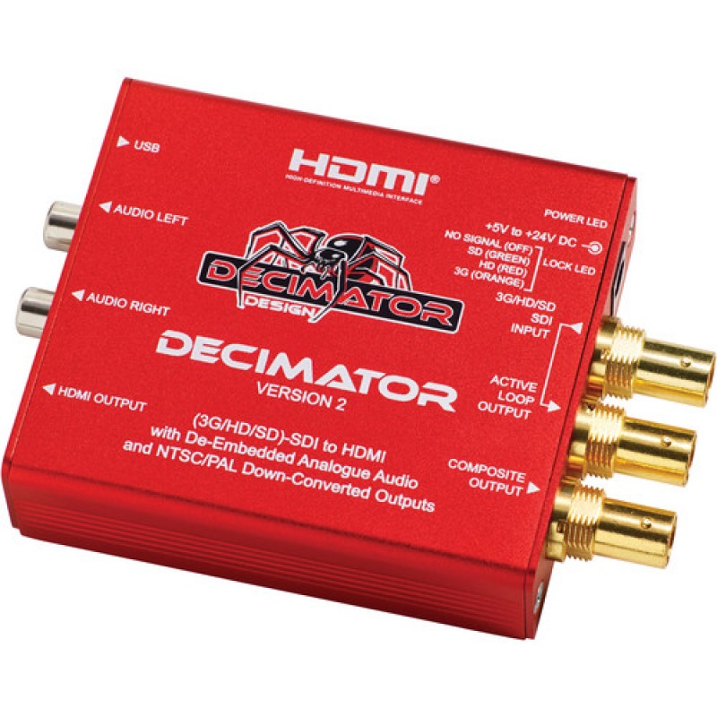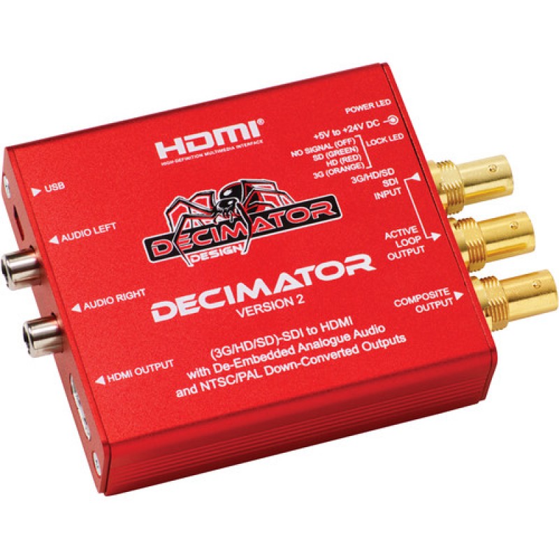 Delivering more than just a basic SDI to HDMI converter, the DECIMATOR 2 3G/HD/SD-SDI to HDMI Converter with Built-In NTSC/PAL Downscaler & Analog Audio Outputs from DECIMATOR provides you with a host of features in a small package suitable for location or a studio environment. The device auto detects the incoming signal, and handles signal switching based on the DIP switch settings you select. The converter maintains a 10-bit data path for your video signal, which minimizes scaling artifacts. It incorporates one SDI input that supports signals up to 3G-SDI, and features a loop through SDI output, HDMI output for the converted signal, and a composite out that automatically scales HD signals delivering either NTSC or PAL video.