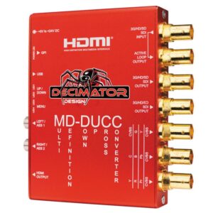 Compact and suitable for use on location or in a studio the DECIMATOR MD-DUCC Multi-Definition Down Up Cross Converter inputs an SD/HD/3G-SDI signal, converting it to SDI, HDMI, and component/composite & Y/C. The unit auto detects the input signal, and maintains a full 10-bit data path from input to output. It features true up/down cross converting between any of the supported formats, you only have to select the output format you want, and the device will auto detect and convert with no further input. This device allows you to convert from HD to SD, as well as SD to HD.