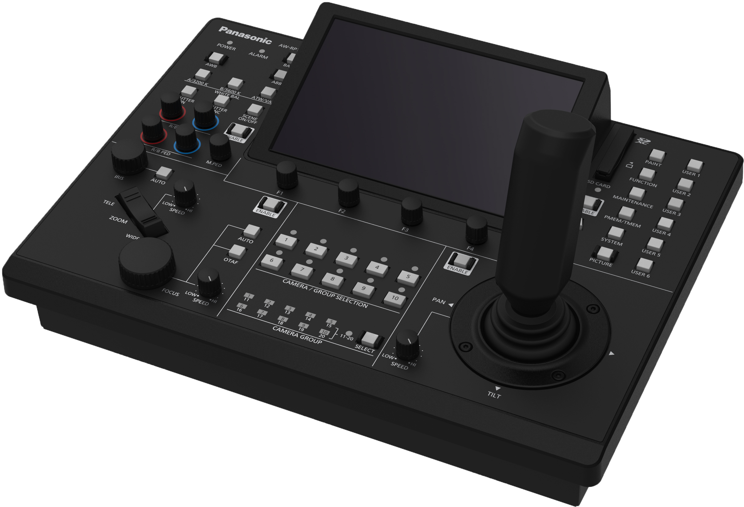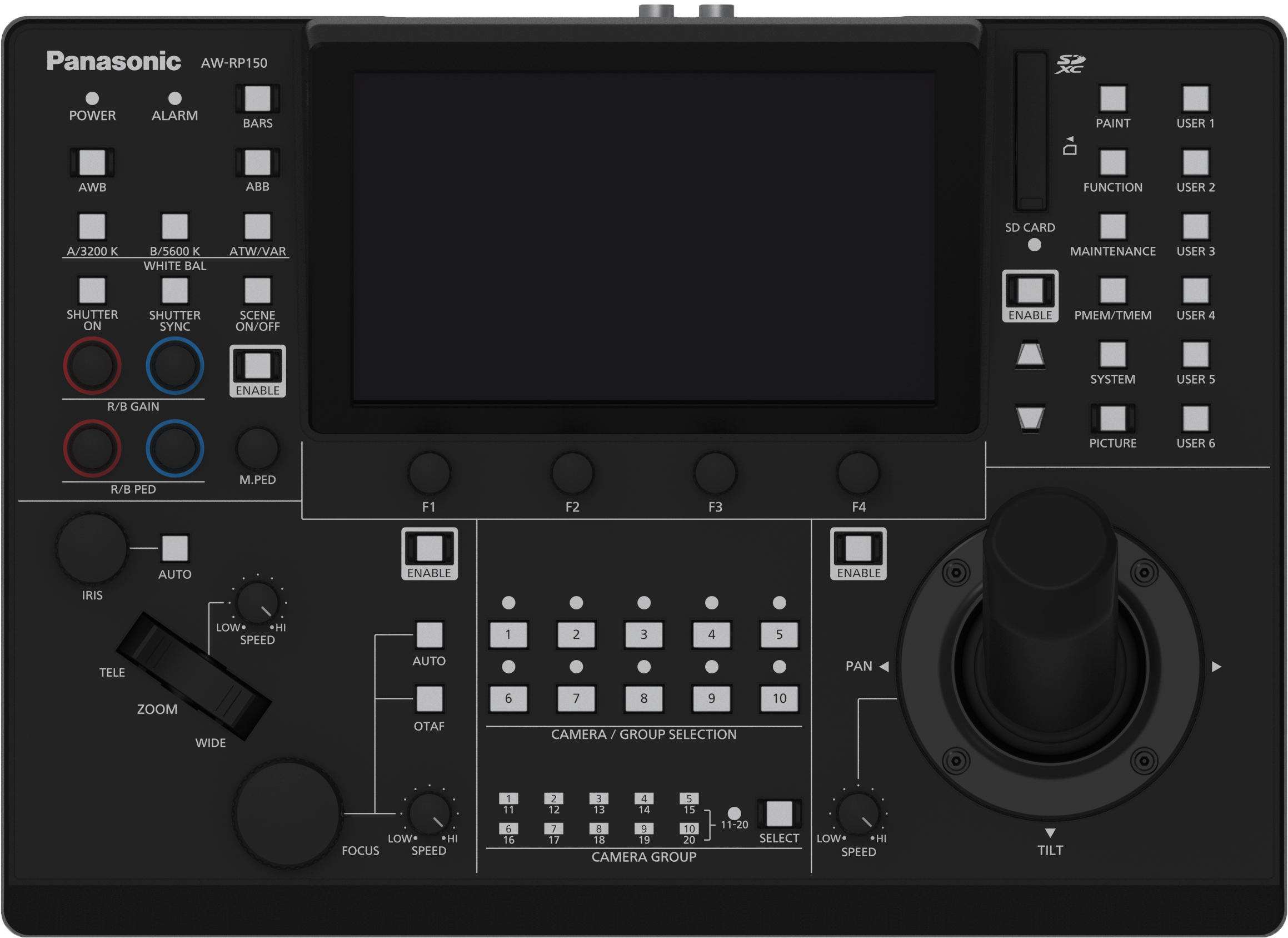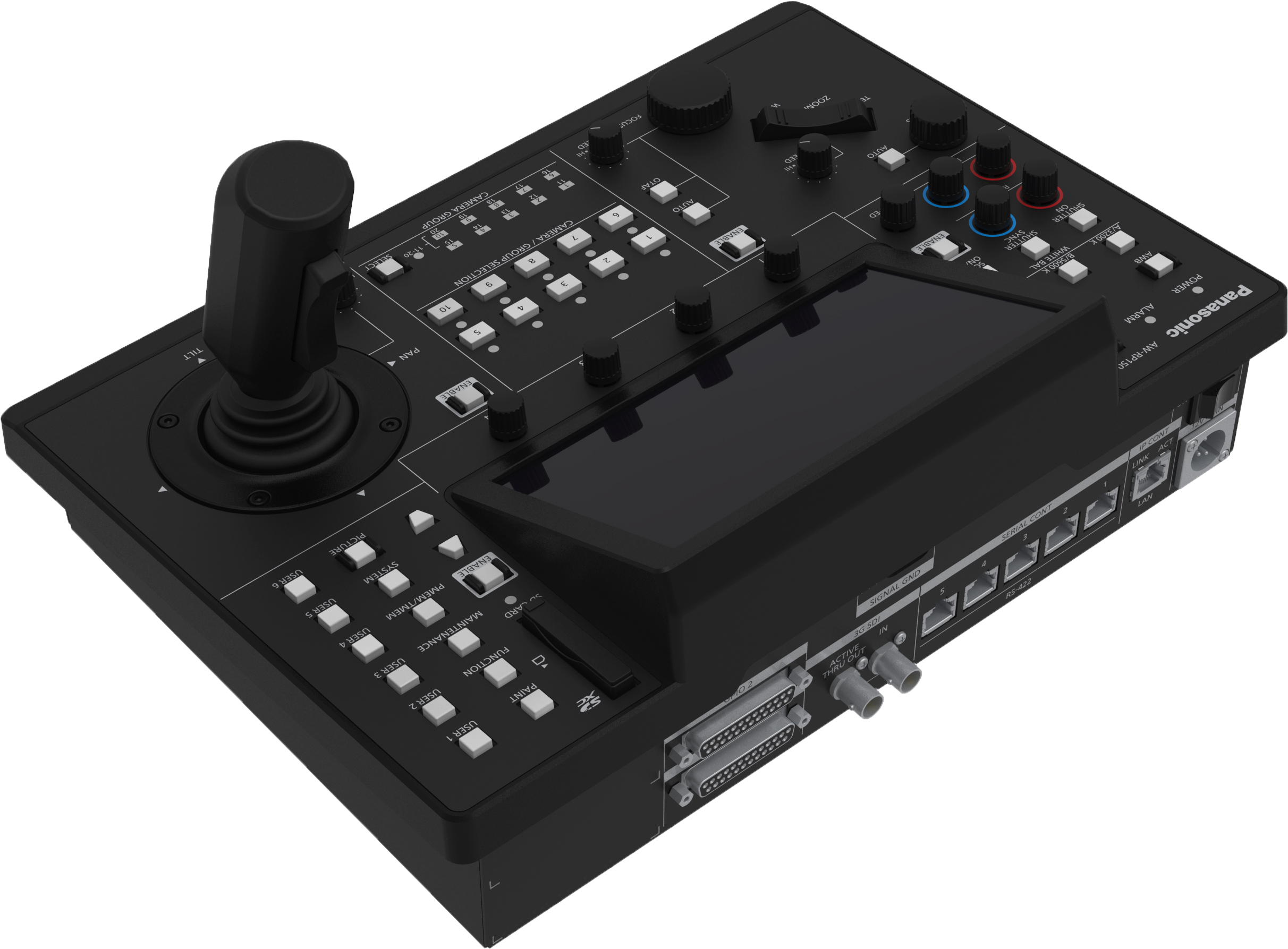 The AW-RP150GJ can control up to 200 remote cameras with IP connection or up to five cameras in a serial connection. The controller features an SD card slot. Scene files, system settings files, and other camera settings can be saved on the SD card, reducing on-location setup time when shooting at events with large numbers of cameras.